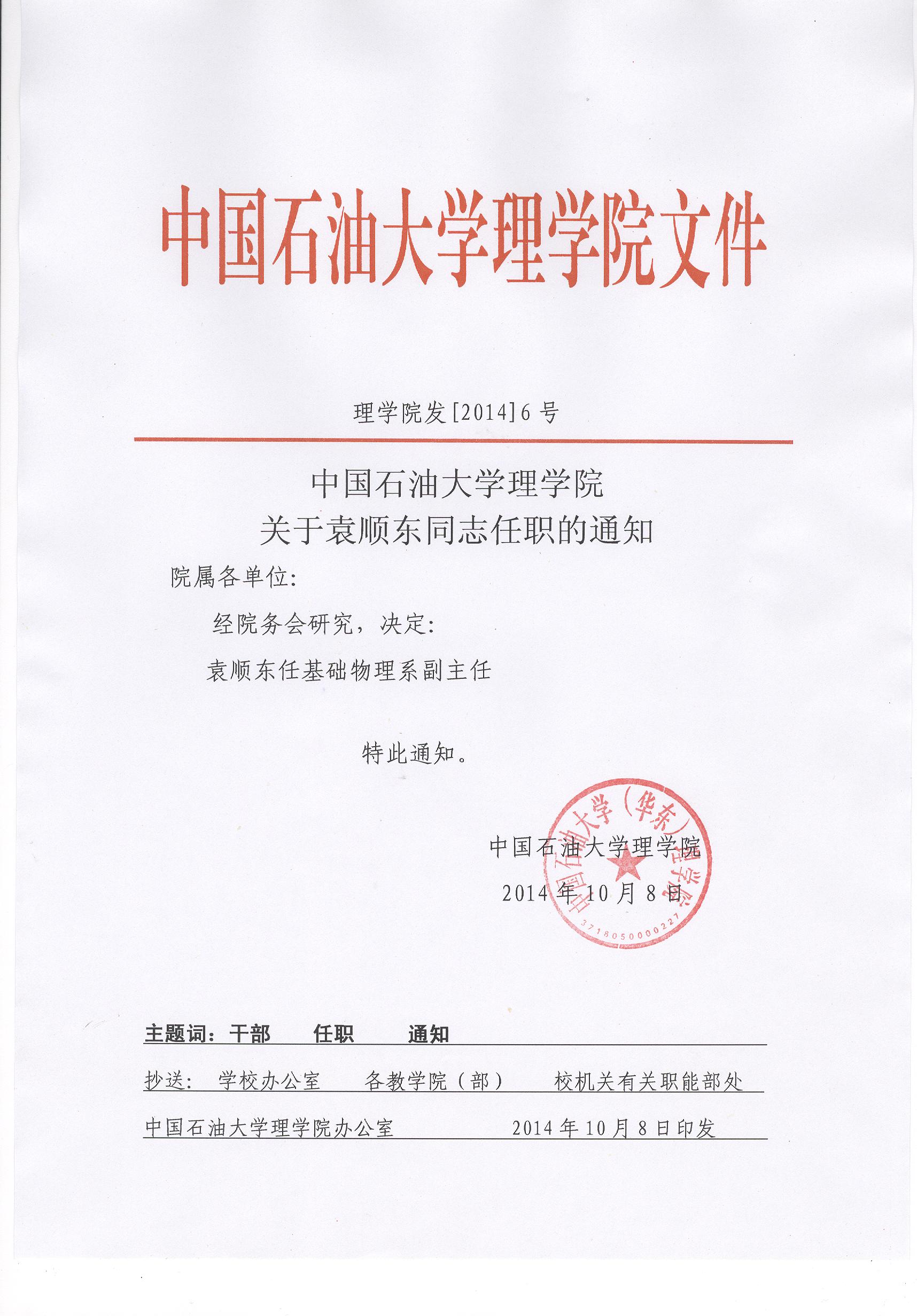 中国石油大学太阳成集团tyc9728关于袁顺东同志任职的通知