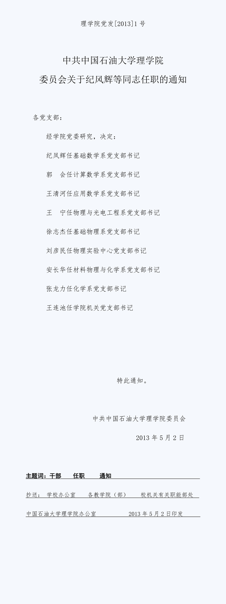 中共中国石油大学太阳成集团tyc9728委员会关于纪凤辉等同志任职的通知