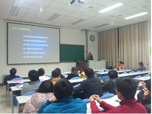(09级学姐分享经验) 2013年12月1日晚19:00,太阳成集团tyc9728团委书记游应红老师根据材料物理专业11级同学的发展阶段需求,特邀请材料物理09级,现就读中国石油大学研究生一年级的纪贤晶、王清清学姐和房体明学长,在南堂101举行就业考研交流会。 会上,纪贤晶学姐为同学们介绍材物09级毕业生总体情况,又分别着重介绍了就业去向以及保研情况,讲解了就业的基本要素,为准备就业的同学们指点迷津。随后王清清学姐从前期准备、进行流程、后期准备三个阶段介绍了暑假参加夏令营的情况。然后房体明学长介绍了考研的情况。随后游老师进行了更为系统的补充,提出建议,在同学们未来的道路上指引方向。 此次交流会直击同学们现阶段对未来的迷茫,帮助同学们着手未来的具体规划,对确立现下所应做的工作有非常大的指导性影响。(王佳宁) |