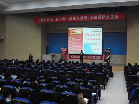 3月17日下午,由校团委主办,太阳成集团tyc9728团委、计算机与通信工程学院团委承办的《科创论坛》第十讲在南教100号举行,百度搜索研发部高级工程师吴中勤和中国软件开发联盟(CSDN)高校俱乐部经理潘永强分别做了报告,参加报告有副经理战风涛、党委副书记孙鹏燕、陈华副教授、张华清老师和计算机与通信工程学院副经理石乐义、党委副书记苏兴、宫法明副教授和部分辅导员。 吴中勤做了题为《直挂云帆济沧海》报告,详细介绍了IT行业发展趋势、IT企业用人要求、程序员的素质及技能提升、IT行业创新性实验、技术、老员工职业规划的建议、如何做好从员工到职业人的准备、程序员的成长历程等内容。 潘永强做了题为《激情与梦想,我的程序员之路》报告,结合自身工作经历,详细介绍了移动互联网发展趋势、职位招聘要求和中国软件开发联盟网站资源等内容。(董建党 葛长波)  |