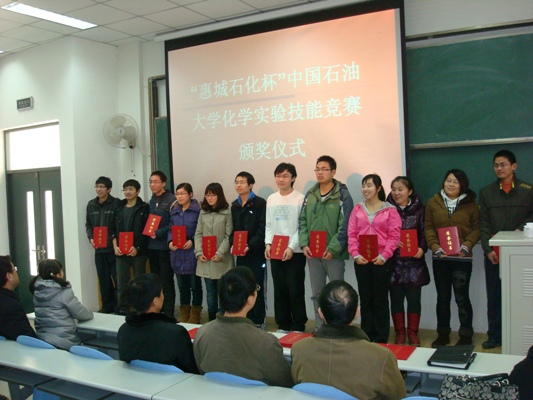 12月18日上午,“惠城石化杯”第三届化学实验竞赛闭幕式暨颁奖仪式在讲堂群东环105隆重举行,学院副经理战风涛教授、化学系党政领导姜翠玉教授、张龙力、张志庆、于剑峰、周玉路老师出席颁奖仪式并为获奖同学颁奖。张志庆主持了闭幕式。 战风涛教授在颁奖仪式上讲话。他首先对青岛惠城石化科技有限公司的大力支持、老师和同学们的积极参与表示感谢,对获奖同学表示祝贺。战经理介绍了本次实验竞赛的目的、理念和意义,总结了竞赛取得的可喜成果及发现的问题。最后战经理强调了化学实验竞赛的宗旨“重视参与、重视过程、重视学习,淡化名次”。他表示,今后此类活动我们还会继续举行,在经费允许的情况下将扩老员工参与的范围和数量。 据悉,本次化学实验竞赛从12月8日开始至12月18日结束,旨在通过竞赛全面推进公司化学实验教学建设和改革,推动设计性、综合性、创新性实验教学的开展,检验实验教学成果,激发员工学习和从事实验研究的兴趣和热情,引导和培养员工的综合能力和创新能力。公司2009级材料化学、应用化学、化学工程与工艺、环境工程四个专业126名本科生参加了此次竞赛,经过理论考试和实验操作,最终评出一等奖12组,二等奖、三等奖、优胜奖各10组。 化学系全体老师参与了筹备工作,竞赛还得到公司化工88级著名员工、青岛惠城石化科技有限公司董事长张新功的大力支持。(化学系 卢玉坤 张志庆)  公司副经理战风涛教授讲话  获奖同学合影 |