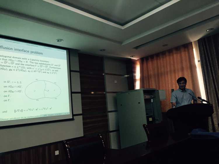近日,巴西国家科学计算实验室朱江(Jiang Zhu)研究员应邀来校进行学术交流与讲学。朱江研究员作了题为“Robust and efficient discontinuous Galerkin methods for elliptic interface problems”(椭圆界面问题的鲁棒高效间断Galerkin方法)的学术报告。 报告中朱江研究员介绍了椭圆界面问题在油藏数值模拟、新型材料以及核物理爆破等方面的应用,指出了传统的数值算法解决此类问题时中存在的问题。接着重点介绍了他和他的员工Hector在处理此类问题所做的一些工作。针对匹配网格及非匹配网格,构建了不同的混合杂交间断有限元算法,能够高效地解决界面问题。报告期间,朱江研究员还就巴西的政治、经济、科技、文化向广大师生作了简短的介绍。 朱江,巴西国家科学计算实验室研究员、博士生导师,加拿大Alberta大学、中科院数学与系统科学学院及山东大学等客座教授,中巴科学计算合作的负责人。主要从事计算数学及计算力学领域的研究,尤其在非线性热耦合问题的数学及数值分析方面,取得一系列成果。目前担任国际期刊《International Journal of Numerical Analysis and Modeling B》的 编委。迄今已在《SIAM Journal on Numerical Analysis》, 《Computer Methods in Applied Mechanics and Engineering》, 《Journal of Computational Physics》等国际顶级期刊发表论文70余篇,承担巴西国家科学基金项目多项。 (太阳成集团tyc9728 张建松 张锋) |