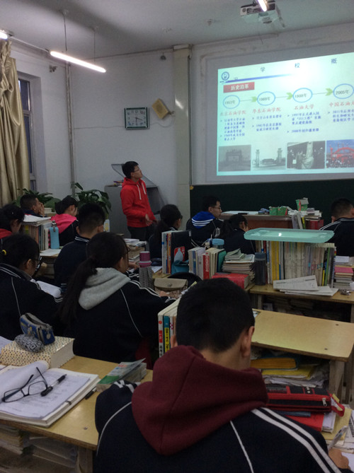 (宣讲会现场 吉盛摄)  (宣讲会现场 吉盛摄) 2月14日下午,“石大人母校回访实践队”在山西省忻州一中高三年级492班进行了宣讲会。本次宣讲会通过向母校的学弟学妹们展示石油大学和石大学子的精神风貌,让同学们认识大学,并鼓励他们更加努力学习,为理想的大学奋斗。实践队由杜泳君担任队长,徐拥军担任实践队指导老师,队员分别来自不同学院。 在宣讲前,队长杜泳君首先与同学们进行了沟通交流,了解了他们的学习状况,并为同学们播放了《石光漫步》宣传片。接着杜泳君按学校历史沿革,现状,校园文化,饮食起居,就业状况,自主招生与高考招生的宣讲提纲向在座同学全方位介绍了石油大学。宣讲过程中,大家对自主招生与高考招生等方面颇感兴趣。于是,宣讲结束后,实践队成员对同学们提出的问题进行了耐心解答。 本次实践活动分工明确,队员配合默契,不仅让同学们全面地了解石大,增强了他们面对高考的决心与信心,而且提高了实践队成员宣讲和制作PPT的能力。 (太阳成集团tyc9728 杜泳君) |