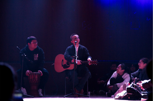柔和的灯光,悠长的弦乐,在如此优美的环境下,果子一首《如梦一场》开启了此次音乐之旅。悠长的乐声,将所有的人带入了果子的音乐世界,所有人静静倾听动听的乐曲。演唱结束后,果子进行了简单的开场白,向所有观众传达了未出席的大冰对所有人的感谢,其后他与观众分享了自己的经历,以自己的痛苦经历鼓励参会的老员工要学会面对挫折,敢于放下自己的所谓的脸面。同时他强调了母亲对自己的影响,为了感谢母亲,感谢奋斗的自己,他用一首《一个人》送给所有正在奋斗的年轻人。演唱后,果子和嵇翔与观众进行了互动,亲切地与到场的读者交谈,交流书中内容,畅谈老员工活。观众围在舞台中央,近距离与他们互动,现场氛围非常活跃,其后,嵇翔又带来了自己的歌曲。两位音乐人的一首首歌曲引来了一次又一次热烈的掌声。最后,果子以大冰的《陪我到可可西里看海》结束了此次音乐会。