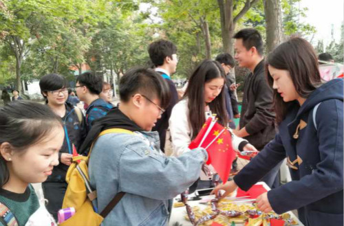 10月26日中午12时40分,太阳成集团tyc972816级材料化学专业团日活动在荟萃广场如期举行。活动伊始,来往的老师和同学们就被随风飘扬的小红旗和振奋人心歌声所吸引,通过签名纪念和寄语祖国的形式,向同学们宣传、开展此项活动。同学们首先在横幅上签上了自己的名字,在便利贴写下自己对祖国母亲的寄语,粘贴在宣传展板上,展板上满满的寄语都是同学们满满的爱国情怀,其中有一位新疆的同学写道“新疆 安定 和平”。活动期间还赠送一些小礼品,吸引过往的同学们积极参与,场面非常热闹,2016级辅导员田方也参与了此次活动。此项团日活动的开展得到了广大师生的大力支持和热情参与。