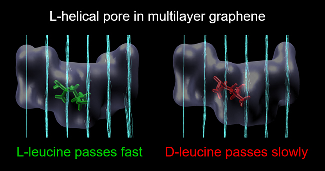 石墨烯纳米孔在气体分离、海水淡化及分子识别通道等方面受到广泛关注。已有研究多集中于单层石墨烯纳米孔的研究,关注于纳米孔的尺寸、形状及边缘官能团修饰等对分子和离子的识别作用。燕友果副教授借鉴生物通道的特征(具有一定的长度、多个官能团参与识别),在单层石墨烯纳米孔基础上设计了多层石墨烯通道,并通过旋转设计了手性通道。此设计将纳米通道的识别从二维升级到三维。研究结果表明,相比二维通道,三维通道展现出更强的离子选择性,同时旋转的手性通道也实现了对映分子的选择性输运。这对于选择性纳米通道的功能设计具有一定的借鉴和参考价值。Nano Letters两位评审专家对该科研成果给予充分肯定,认为带来了很多新奇的思想和设计,第一次揭示了多层石墨烯纳米通道的新性质,相信将激发一系列新的理论和实验工作。