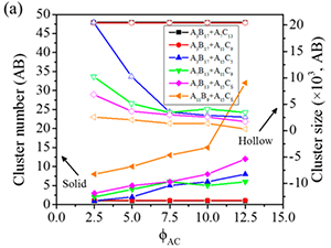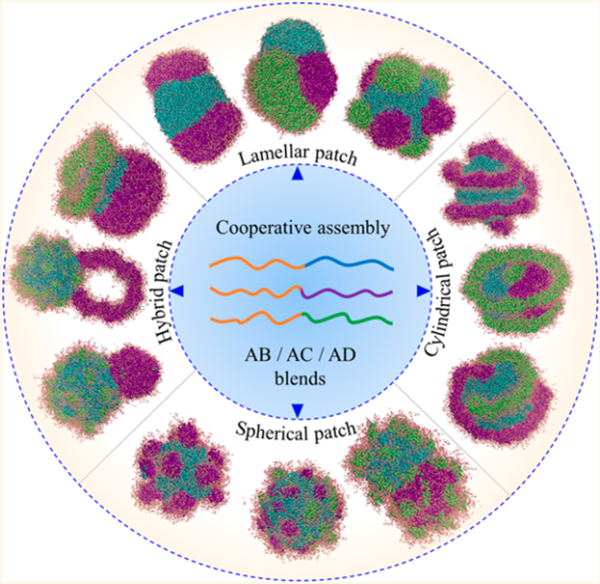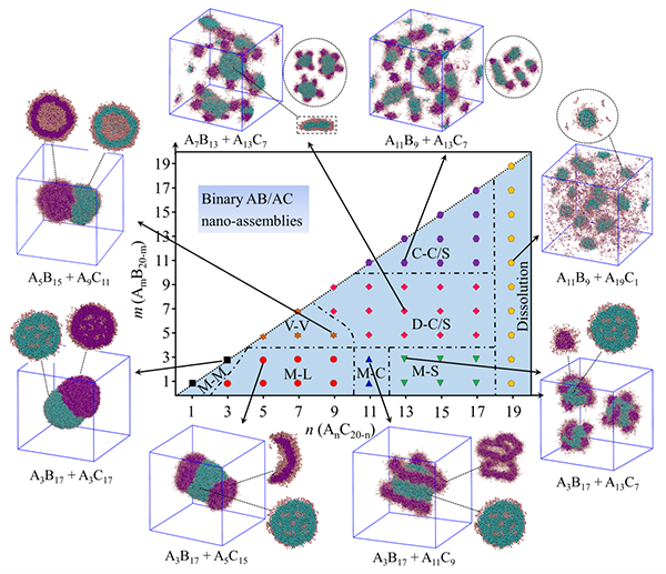 针对上述难题,胡松青团队在国家自然科学基金和中央高校基本科研业务费专项资金项目的资助下,采用耗散粒子动力学模拟方法探索了复合型嵌段共聚物混合溶液的协同自组装,从共聚物的分子构象和官能团化学性质(共聚物自身分离度、不同分子混溶度、相对浓度、溶剂选择性等参量)的角度对该体系进行了系统的理论研究,从分子原子层次揭示了线/线共聚物共混体系的协同自组装机理,获得了大量几何形貌复杂的复合纳米组装体,并基于得到的特殊构型进行了组合方案设计,提出构建和调控新型多级纳米组装体的新思路,研究成果有助于推动新型软物质纳米器件构筑理论和技术的发展。