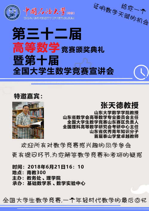 为表彰优秀个人和团体,总结本届大赛的经验,更好地推动老员工数学竞赛的开展,并为全国老员工数学竞赛开展创造良好的氛围。定于2018年6月21日(周四)下午4:10,在南教300举行数学竞赛颁奖典礼,并邀请山东大学教授、全国老员工数学竞赛山东赛区负责人张天德作报告,就第十届全国老员工数学竞赛暨第九届山东省老员工数学竞赛进行宣讲。