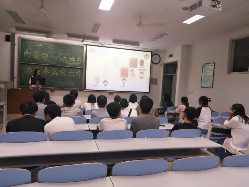 活动伊始,由商静组织全体成员共同观看中国共产主义青年团第十八次全国代表大会宣传视频。继而分配小组,将全体成员按照学号依次分成4个小组,组织提问并记录各小组分数。每个小组根据视频内容回答两个问题并记录小组分数。其次介绍了三个著名团干部。在此期间,大家共同观看“采访团十八大代表,走进青年之声”的视频。同时讲述了苏明娟“大眼睛女孩”照片的来源视频。活动最终,围绕喜迎中国石油大学六十五周年校庆,组织几组得分少的同学,拿着团徽前往石大校园著名景点建筑去拍照。
