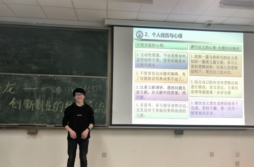 活动伊始,由潘思琦对刘杰进行了介绍,而后刘杰针对创新创业发表了自己的一些见解。首先,他认为在大学期间开展创新训练能够激发学习兴趣,引起对专业的热爱;而对于准备读研的同学来说,开展创新训练能够初步体验研究生生活,对未来考研还是就业做出选择。“考研还是就业不是待在宿舍想出来的,而是需要亲身体验的;同时,如果想要冲击清华、北大等全国顶尖高校,科研成绩必须十分优秀”,刘杰结合自身的经历说道。