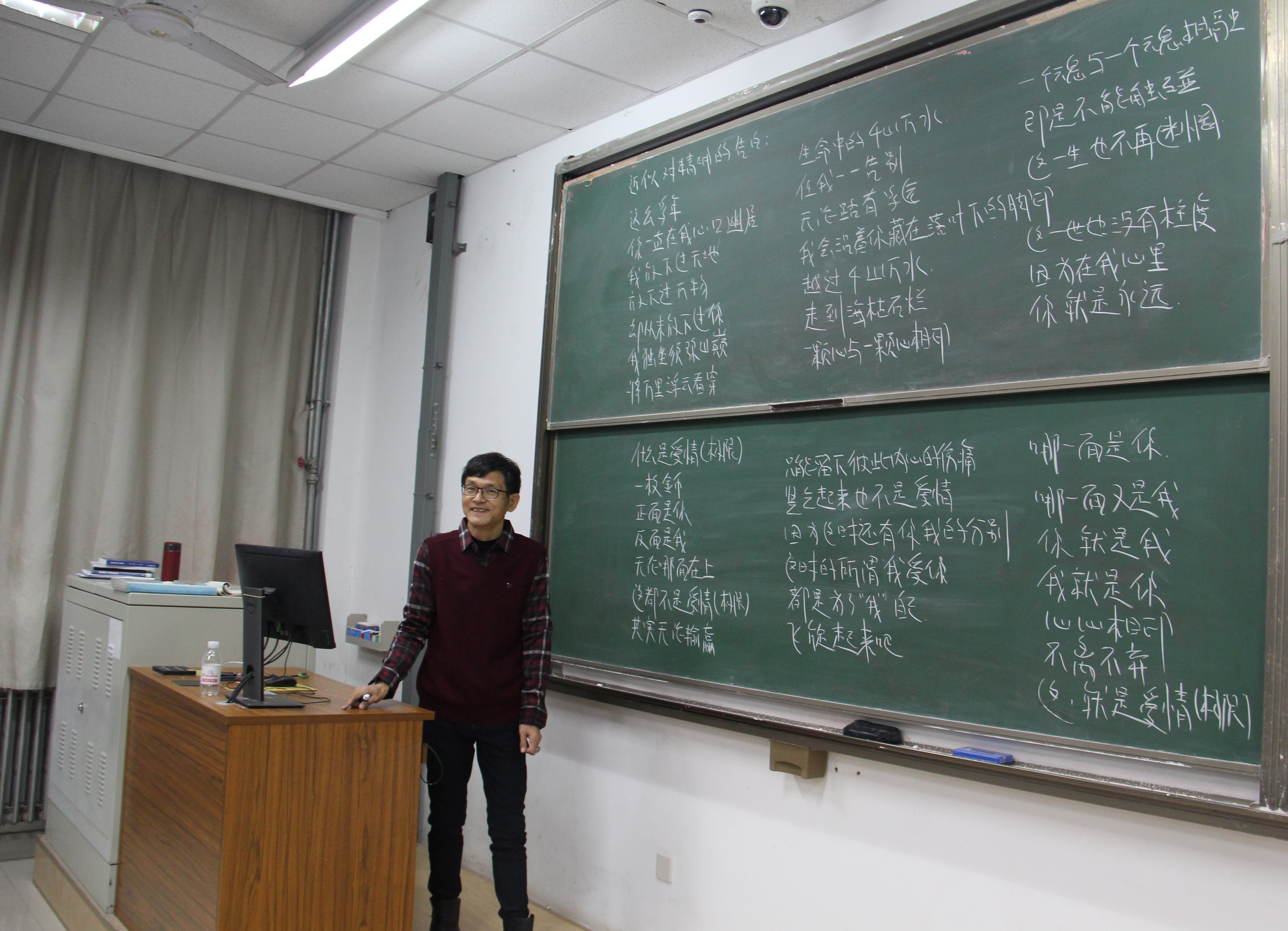 当聊到诗的出处时,张丹青笑了笑说到有些是自己写的,有些是觉得意境和概念很像借过来自己又改编的节选一部分变成自己的,话语中除了激动又带了一点一点小小的自豪,也看出了他对数学的热爱和对员工的负责。张老师说“当老师的幸福就在这里,两个人好像心心相印,它在和你交流互动,数学很枯燥很少能让人产生共鸣,如果把数学的内含、真实的方面以及美的方面,对立统一的思想展示出来,从员工来看,大家还是喜欢真善美的。