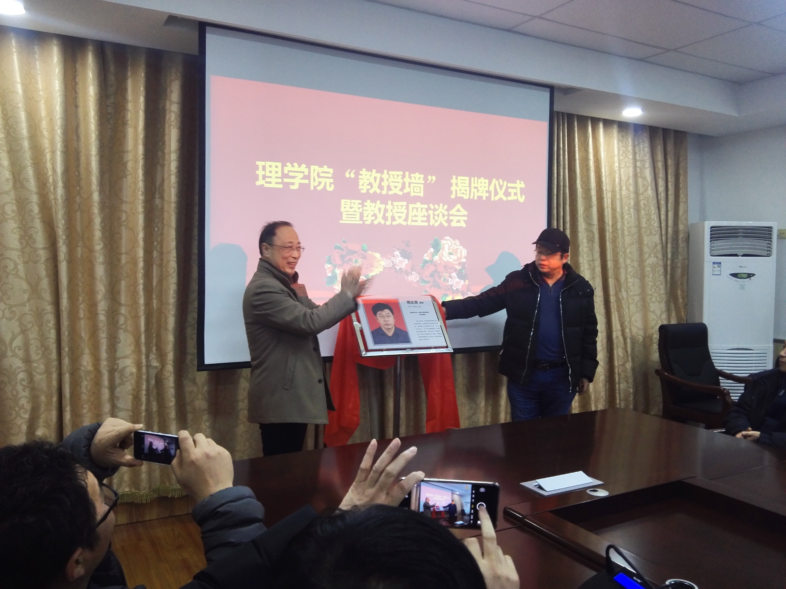 随后,举行了简短、富有仪式感的“教授墙”揭牌仪式。经理魏宝君教授和蒋达清教授共同为“教授墙”缓缓揭下幕布,大家热烈鼓掌,并不时拍照,珍藏属于自己的光荣时刻。