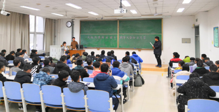 本次活动分为主题演讲及知识竞答两个阶段。首先,光电1801班团支书李政彦作演讲“让我们携手并肩,开启下一个辉煌的四十年”。他在演讲最后发出了掷地有声的口号,引起全场热烈的掌声。改革开放知识竞答包括选择题、填空题两部分,主要考察改革开放40周年大会中习近平主席讲话的重要内容,设置一、二、三等奖,且备有相应的小奖品。作答完成后,光电1801班团支书乔良欣发表演讲,再次号召员工们“刻苦学习,奋发向上,为祖国的改革开放、民族的伟大复兴作出贡献”,最后由耿志轩宣读获奖结果。钟嘉晨表示:“改革开放给中国带了来巨大的影响,作为当代老员工,应该了解和运用习近平总书记在改革开放四十周年大会上的讲话。这次活动,很有意义,提醒当代老员工要尊崇历史,顺应时代潮流。”