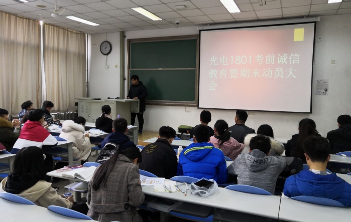 12月27日下午,光电1801班于南堂116室隆重举行第三次班会,内容主要为考前诚信教育和期末动员,班主任展凯云出席,全体班级成员参加。