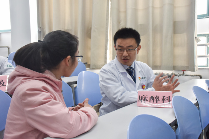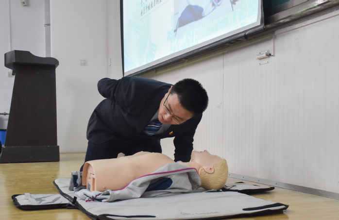 活动伊始,孙玉婷向参与人员介绍出席本次活动的医师。随后,眼科医师崔婷婷以及口腔正畸科医师马晓蓓分别向员工介绍眼球结构、眼科常见疾病以及成年人矫正牙齿等基本知识,提醒员工正确用眼、用牙,希望员工平时注意爱护自己的眼睛和牙齿。继而,泌尿内科医师王强用提问题讲故事的形式向员工阐述了肾脏结构以及功能,希望员工及时认识和预防肾脏疾病,保护肾脏。接着,麻醉科医师魏彭辉向参与人员介绍心肺复苏的急救方法,并进行现场示范,数学1701班卢隽表示:“我们之前对健康知识没有太多了解,通过今天的讲座,我学到了很多,我对心肺复苏的示范教学印象尤其深刻,它教会了我们在以后的紧急情况中冷静镇定地处理问题。”活动接近尾声时,齐鲁医院开展义诊环节,同学积极参与。