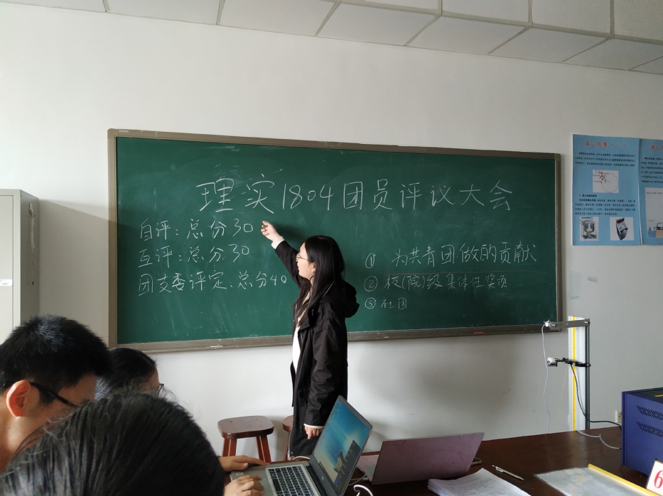4月1日,理实1804团支部于基础实验楼D605召开团员评议大会,全体班委到场参加,部分员工旁听。经过前期的学习动员,团员自评和团员互评工作,本次团员评议大会的内容主要包括组织鉴定和总结评比。团支书陈雅薇讲解评议细则和标准,团支部副书记董朝阳担任会议主持人,宣传委员史佳记录,会议过程在班群中全程直播。所有参议的班委按照公平,公正,公开的原则,对每位团员提交的材料认真审核,并严格依照学院要求,按团员自评,团员互评,团支部鉴定三个步骤对每位团员打分评议,同时,团支部听取旁听同学的意见,在其监督下进行评议,确保对每位团员负责。