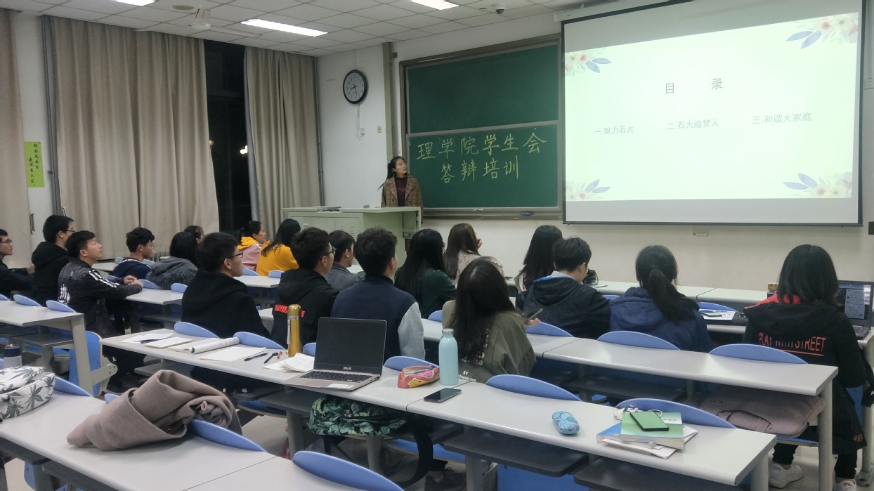 本次答辩的主题为“竞选答辩”或“话说石大”,答辩人依次上台进行答辩,然后由评委提出建议,内容涉及到模板的选择与制作、肢体语言与眼神交流等。外联部的雷文韬在答辩时没有与观众进行任何眼神交流,经评委指出后,再次尝试,作出较大改变。最后,活动负责人商静对本次答辩培训活动进行总结,她表示,本次活动提供了一次提升自我的机会,并感谢大家的用心准备与付出。