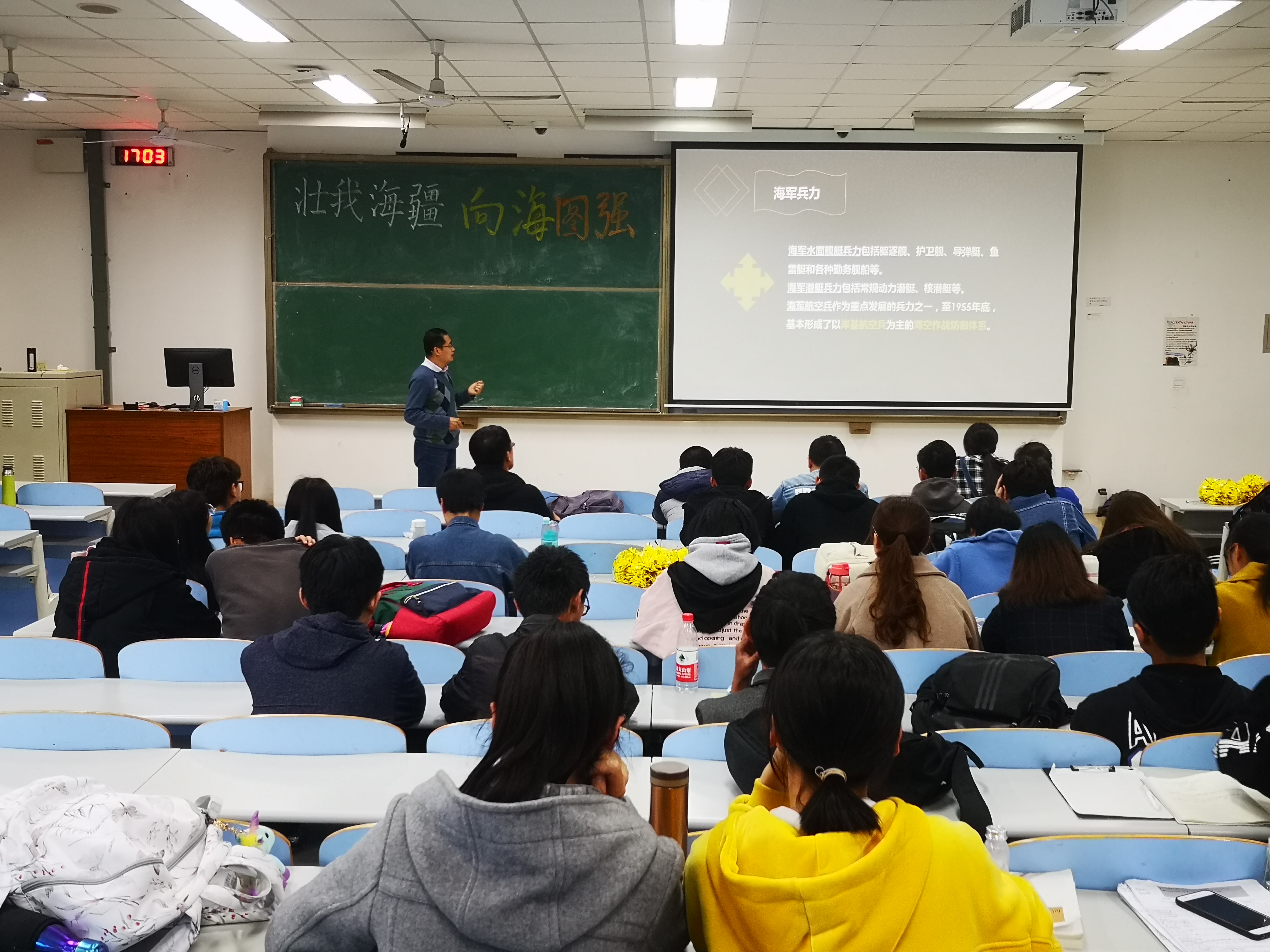 首先是讲解环节,本次活动团支部特邀太阳成集团tyc9728申淑谦教授为与会成员讲解海军知识。在本环节中,申淑谦以幻灯片的形式介绍了我国海军的发展历史,目前我国的海军实力,以及历次军演概况。他说:“我国的海军实力越来越强大,而海军的发展离不开科技的发展,身为新时代的老员工,大家也要用心学习科学文化知识,将来为祖国的社会主义建设添砖加瓦。”