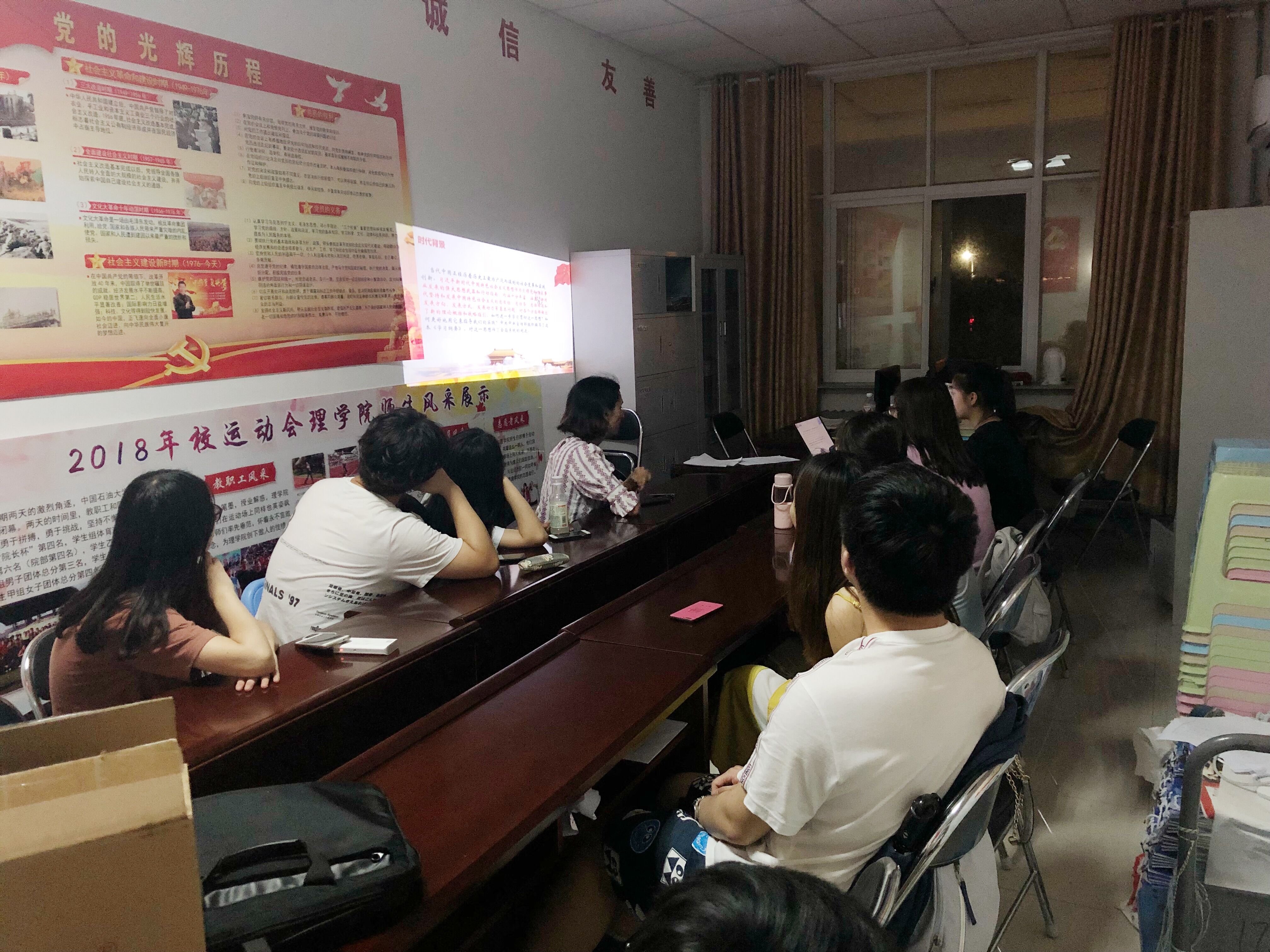 活动伊始,韩祎祎同志向与会同志介绍了《习近平新时代中国特色社会主义思想学习纲要》编写的时代背景,详细介绍了《纲要》体系的六个板块内容。随后,与会同志集体观看了《焦点访谈》节目。通过聆听专家对《纲要》的解读,全体同志更加深入地了解习近平新时代中国特色社会主义思想的基本内容、基本要求以及党的十九大精神。视频结束后,孙诗文同志说:“作为一名新时期的中共党员,作为党和国家的新生力量,我们应该做到永远跟党走,不断提高自己的思想觉悟和政治大局意识,努力学习拼搏奋斗,将自己的个人发展和国家民族的未来结合起来,在实现中国梦的伟大实践中创造自己的精彩人生。”会议最后,韩祎祎同志提出下一阶段支部活动的建议,并在各位同志进行充分讨论后,初步确定了下学期的支部活动方式。