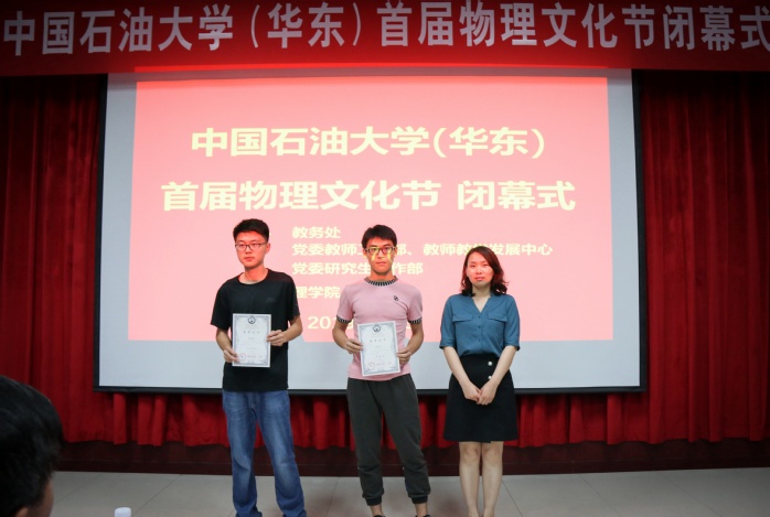 应用物理系老师刘学锋介绍了中国老员工物理学术竞赛(CUPT)的开展情况,以及公司进行校内初赛、组织青岛四高员工谊交流赛、参加华东高校地区赛的情况。物理文化节期间,公司代表队在厦门大学举办的华东地区高校老员工物理学术竞赛获得三等奖,张迎鹏同学获得最佳反方奖。闭幕式上,太阳成集团tyc9728经理魏宝君和教务处宋守浩为代表队员举行了颁奖仪式。