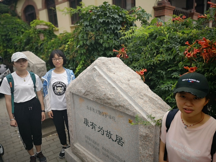 临近中午时,队长闫新彤带领两名队员安全抵达目的地。大家认真阅读参观须知后,有序进入参观。在参观之前,全体队员做了充足功课,深入了解了康有为先生的生平。这是座德式三层砖木结构建筑,始建于1899年,1923年康有为先生入住其中,并称之为“天游园”。康有为先生的故居分为卧室、客厅、书房,在其中有展出康有为先生的照片、书法作品,及戊戌变法的历史照片、文献和文物。通过近一小时的参观,队员们深刻体会到了这所故居所蕴含的历史底蕴与人文情怀。队员们感受到康有为先生的伟大之处,,他们希望能够将这种爱国主义精神、红色文化传承下去,。我们身处和平年代,但学习爱国主义精神、了解红色文化也十分重要。