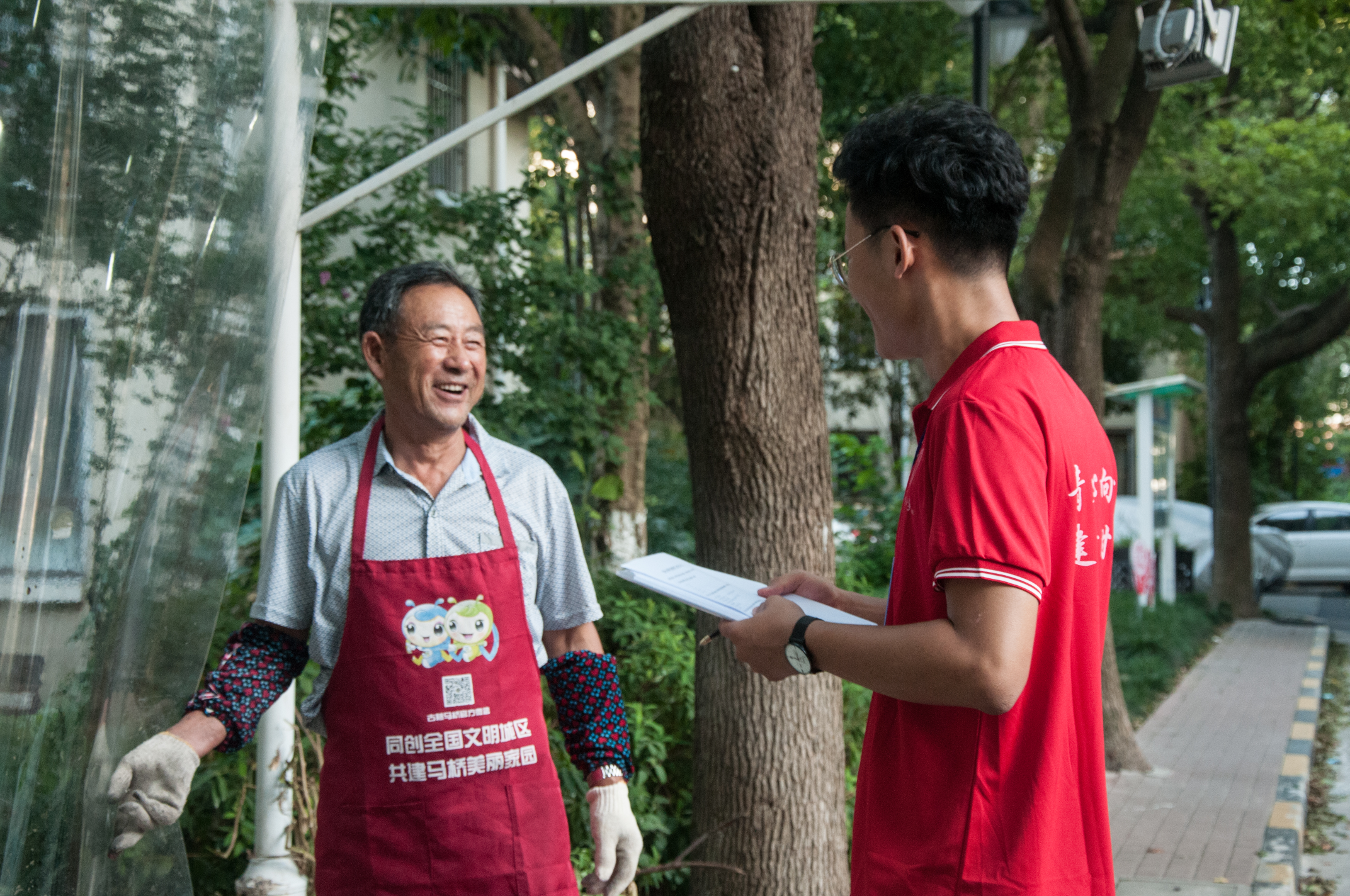 小区工作人员与志愿者进行交流今日垃圾分类情况 孙元伟摄影