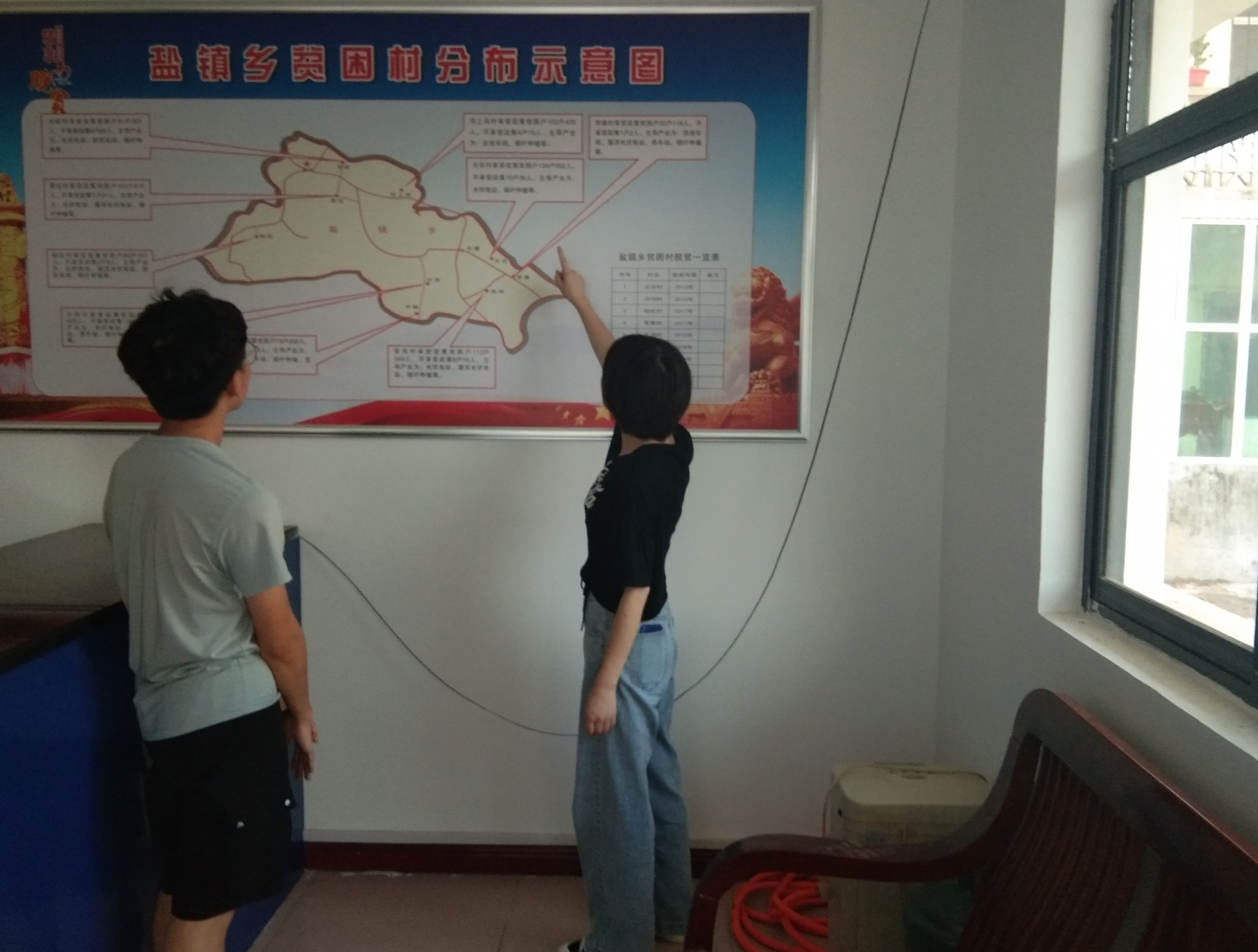 首先,实践队员来到盐镇乡人民政府,同扶贫办工作人员交谈了解情况。工作人员向实践队介绍,近些年来盐镇乡因地而异、因人而异,通过建立服装厂、养殖场、蔬菜大棚等帮助农民增收,并大力加强基础性建设,整治环境。