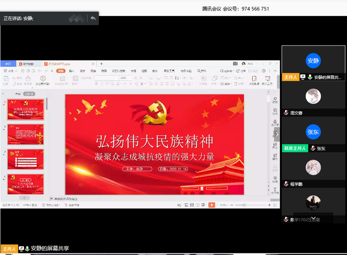 4月15日下午,数学1702团支部在腾讯会议举办了主题为“弘扬伟大民族精神”的团日活动。新型冠状病毒感染的肺炎疫情牵动着无数国人的心。这不仅是对我国治理体系和能力的一次大考,更是对中华民族意志和民族精神的一次严峻考验。