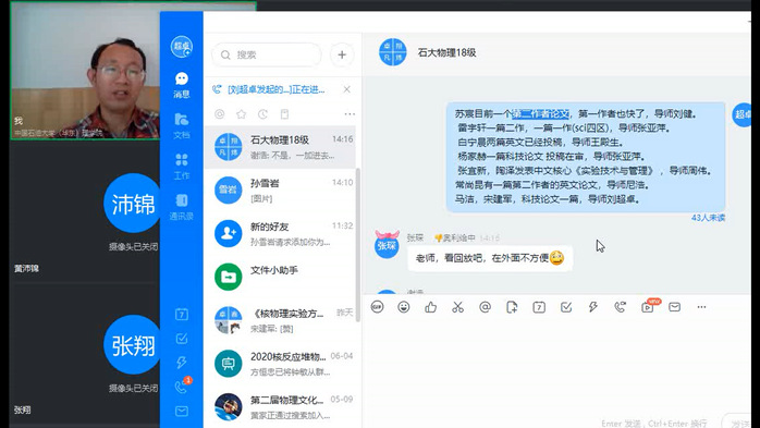 兼职辅导员刘超卓首先强调了防疫期间做好个人安全防护、个人情况每日上报、课程考试严肃考纪等事项。紧接着又介绍了2016级毕业班的保研、成功考研、出国、就业,找工作,考研二战的情况,以详实的数据,细致的分析,给大家树立了目标,增强了信心。随后,他又一一介绍了2017级员工基于大创项目和本科生导师指导所取得的阶段性创新成果,对大家提出了殷切希望,给大家加油鼓劲。会议最后,各位员工一一谈了自己的感想体会,介绍了自己的在家学习的情况、与导师联系的情况、大创项目的研究进展,以及下一步的计划展望和远期毕业目标,刘超卓对在场所有人都一一进行了细致、具体的指导和讨论。