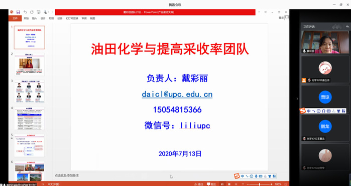 为深入了解油田化学专业,促进老师与员工之间的密切交流,学校油田化学与提高采收率团队负责人戴彩丽教授于7月13日上午开展线上交流讲座。本次讲座由化学1701班团支书姜玉洁主持,17级化学专业全体员工参与。