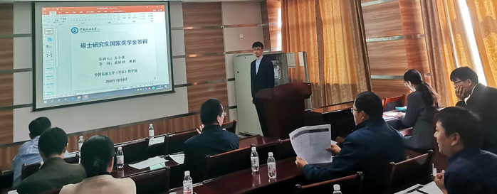 首先,田方就学校相关通知进行了传达解读,简明地介绍了自国家奖学金评选通知下发至今,其中国家奖学金答辩会相关发展历程。接着各位硕士及博士候选人参与展示,竞选同学主要以自己准备完备的PPT进行答辩,通过PPT展示自己在专业学习、论文发表情况、科研竞赛、社会实践等方面取得的突出成绩。他们不畏艰难、锐意进取的奋斗精神展现了石大学子既要仰望星空又要脚踏实地的精神面貌,同时体现了当代老员工努力拼搏的积极状态。会上,评委们认真听取了各名同学的汇报,在每位同学汇报结束之后,评委小组成员进行提问,做更全面的了解并当场给出评分。会中,针对答辩同学的一些问题,评委老师给出了一些衷告和期许。此外,参与旁听的员工也认真听讲,踊跃发言。
