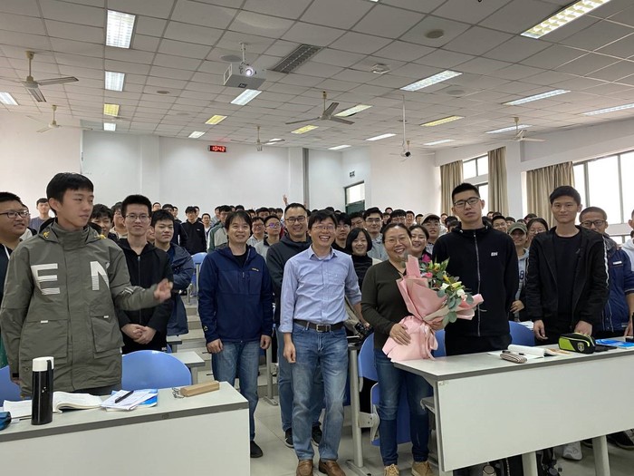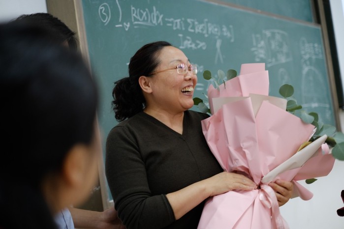 2020年10月30日上午10点35分,当下课的铃声响起的时候,在东廊102教室里,一场温馨而隆重的欢送会正在登场。这是应用数学系张爱芹老师在岗的最后一堂课,再过一个小时,张爱芹老师就要告别三尺讲台,光荣退休啦。应用数学系的李明主任、张建松书记和吕川副主任携部分教职工来到东廊102,在全体员工的见证和掌声下,为张爱芹老师献上鲜花,感谢她从教30余年来,在工作岗位上兢兢业业,任劳任怨,为数学学科做出了伟大的贡献。