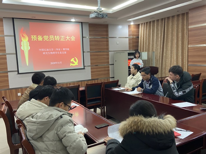 11月30日,研究生物理员工党支部在文理楼254会议室召开了预备党员转正大会。大会讨论关于魏玉鹏等3名同志申请转为正式党员的问题,支部全体党员参加,党支部书记王辉同志、支部全体党员参加,会议由孙淑怡同志主持。