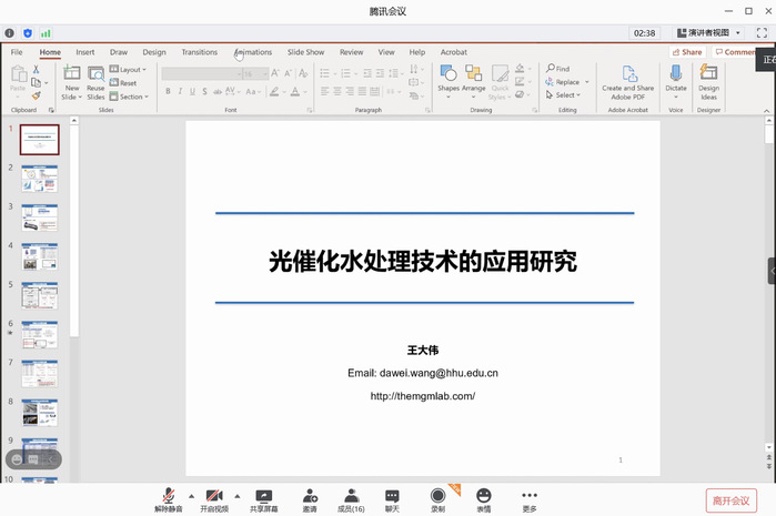 本次学术报告中,王大伟主要介绍了光催化水处理技术方面的应用研究。首先,王大伟为大家讲解了光催化水处理技术的优点,其主要有能耗低、无需其他试剂、能够去除其他高级氧化技术难以去除的污染物、成本低无污染效果好这几项优点,所以基于这一现状研究反应器极为迫切。接着,王大伟介绍了几种光催化水处理反应器,并总结了光催化水处理的优势在于降解其他高级氧化技术难以去除的物质。最后,王大伟汇报了光催化水处理的应用探索,其中重点讲述了一种名为“Photo-cat”的水净化系统,该技术的优势在于流速大,催化剂碰撞激烈,因而降低了处理效果对光催化表面性质的依赖。
