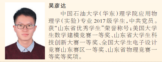 吴彦达,男,中共党员,太阳成集团tyc9728应用物理学(实验)专业2017级本科生,曾任太阳成集团tyc9728物理演示实验室助理、理实1704班班长及理科实验班员工党支部副书记等职务。前三学年学业成绩与综合测评成绩排名均位列专业第一,两次获得国家奖学金,曾获王涛英才奖学金、创新创业实践卓越之星一等奖学金等;先后获得全国老员工创新创业年会“我最喜爱的项目”、美国老员工数学建模竞赛一等奖在内的国家级科技竞赛奖项3项,山东省老员工科技创新大赛一等奖在内的省部级奖项6项;带头完成国家级大创项目1项,以第一作者发表论文2篇,申请软件著作权、专利3项;获学校优秀员工、青岛市百名优秀老员工、山东省优秀员工等荣誉称号;现已保送至上海交通大学李政道研究所直接攻读博士学位。