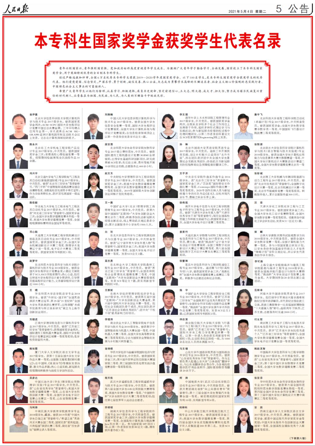 5月4日,《人民日报》第5、6版整版刊登了《本专科生国家奖学金获奖员工代表名录》,公司2017级本科生吴彦达名列其中。