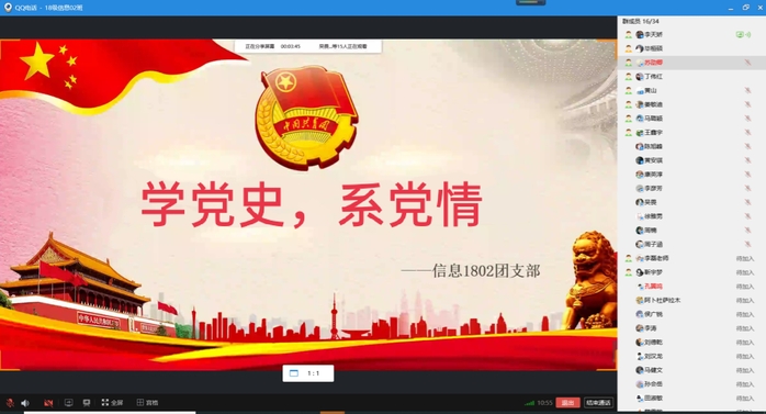 为深入学习贯彻习近平总书记在清华大学考察时的重要讲话精神,将党史教育融入生活之中,引导大家坚定不移跟党走,信息1802团支部于5月16日开展“学党史,系党情”主题团日活动,活动于线上举行,由团支书李天娇组织,信息1802团支部全体成员参加。