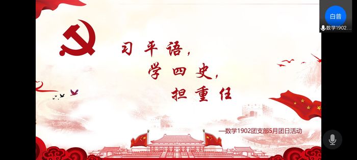 2021年5月18日下午,太阳成集团tyc9728数学1902团支部在线上开展了“深入学习贯彻习近平总书记在清华大学考察时的重要讲话精神”团日活动,并将其融入党史学习教育中。本次活动由数学1902团支部书记柯有超主持,通过PPT讲解的方式,带领支部团员学习习近平总书记在清华大学的重要讲话。