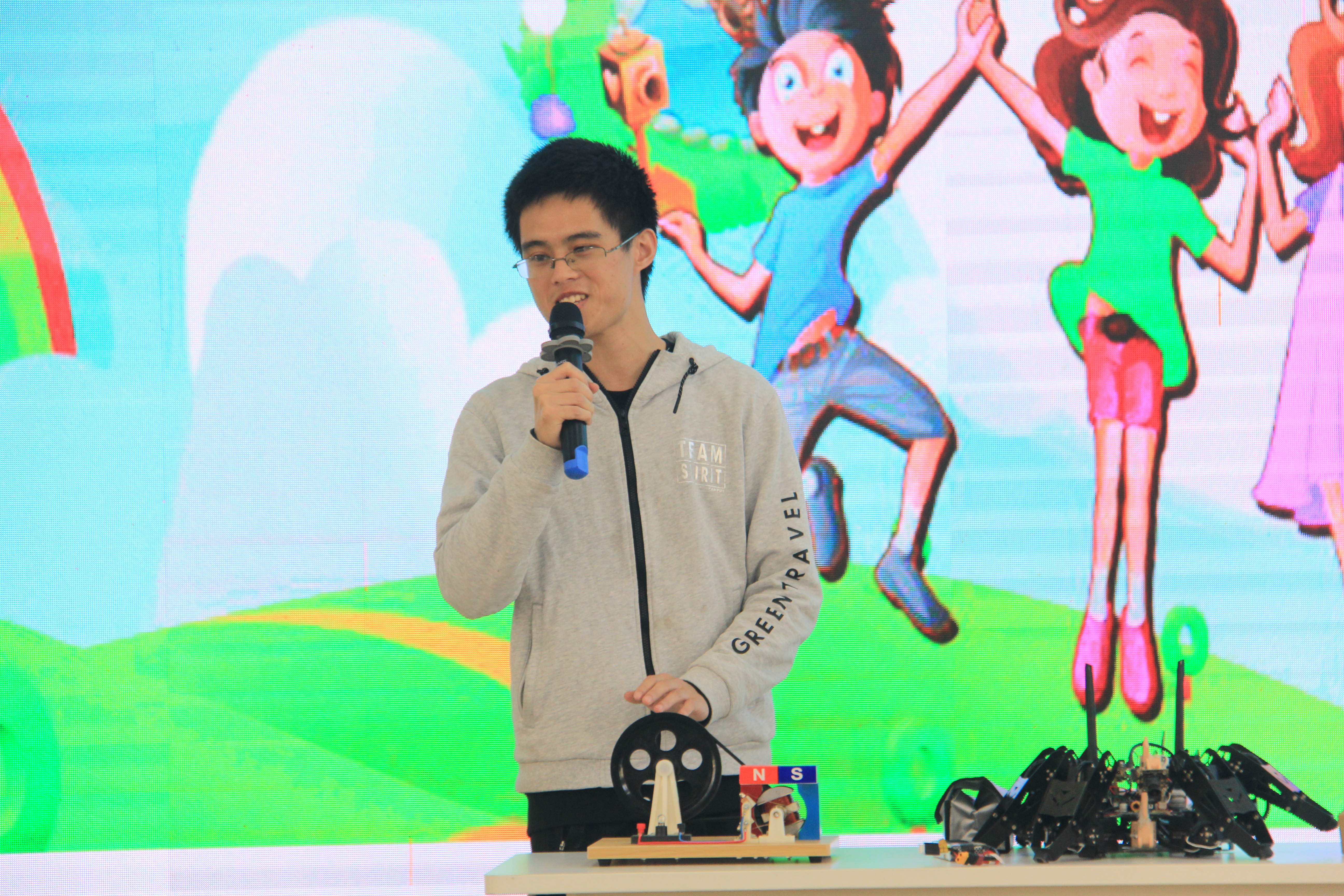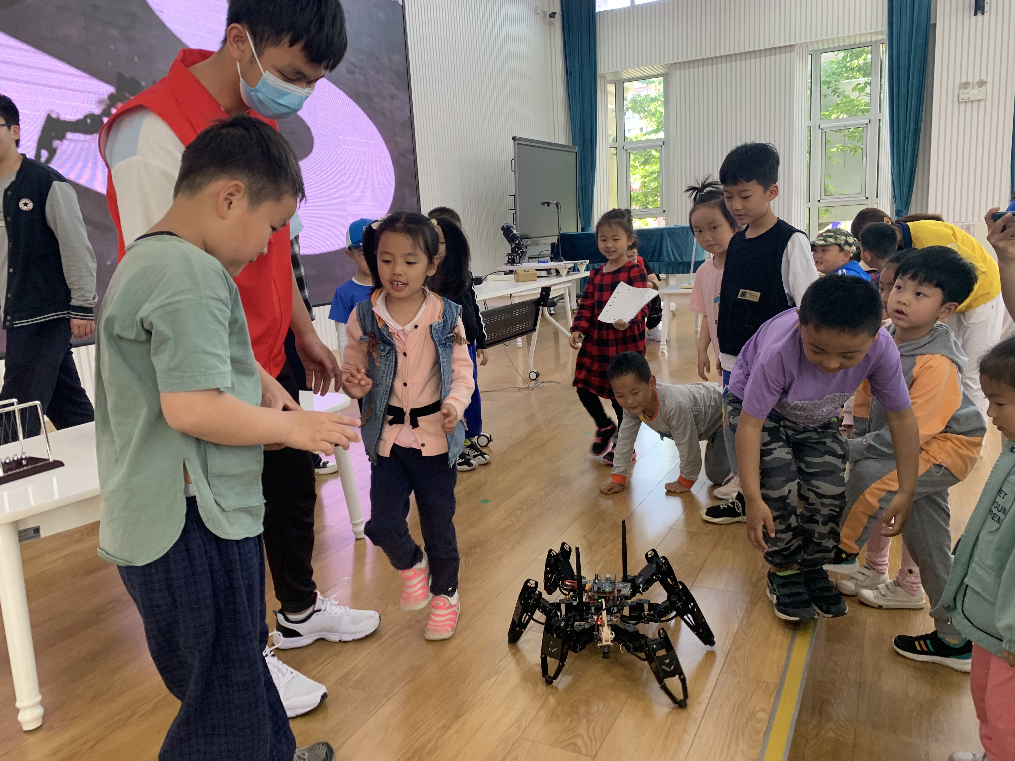 下午15时,老员工志愿者们满载各种科普仪器进入新区一幼。在现场,渡龙集训队成员向小朋友们展示了智能爬行机器人、五子棋机器人的神奇之处;物理演示实验室成员用浅显易懂的词语、妙趣横生的话语搭配直观生动的物理现象,为小朋友们成功演示了“伯努利悬浮乒乓球”、“牛顿摆”、“鱼洗演示仪”、“蛇摆模型”、“手摇发电机”、“多珠竞走”等各种有趣的现象。