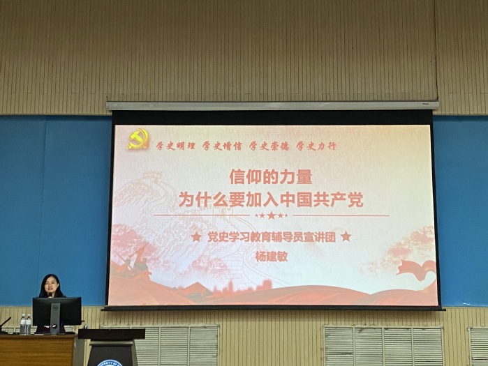 杨建敏以为什么加入中国共产党为主题。为了阐明问题,她从“中国共产党的诞生”、“认识信仰的力量”和“为什么要加入中国共产党”三个方面提高了同学们对中国共产党的认识。她讲到,加入中国共产党,担负时代使命是当代青年人最佳的政治选择。作为一名新时代青年人,一定要真正认识到中国共产党为人民谋幸福、为民族谋复兴的使命。