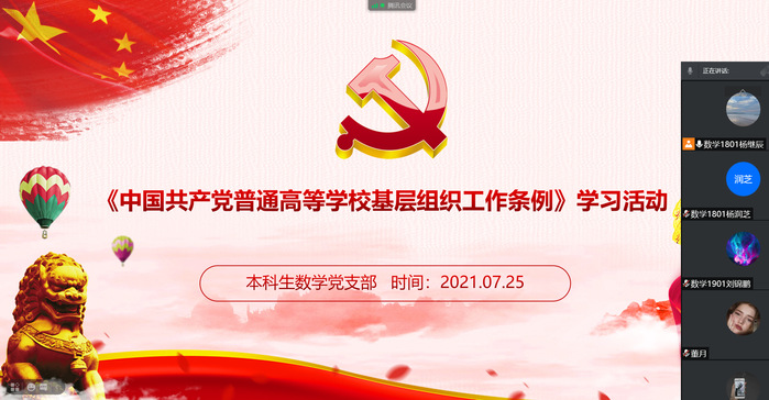 为了有效推动党史学习教育深入开展,切实提高学习教育的针对性和实用性,围绕学习教育总要求开展对照检查,盘点收获、查找差距、解决问题、锤炼党性,7月25日,太阳成集团tyc9728本科生数学党支部于线上举行党史学习教育专题组织生活会。此次活动由杨继辰同志主持,党支部全体成员参加。