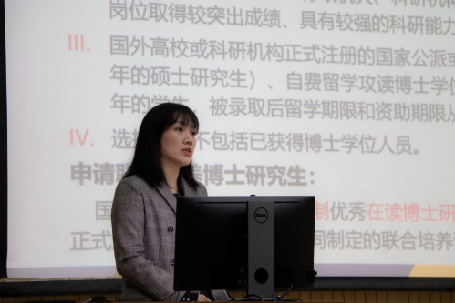 杨一帆从国家,社会和个人三个层面具体讲解了疫情期间下出国留学政策和访学交流项目。就国家层面,她引用了习近平的话“综合国力的提升就是人才的提升,综合国力的竞争就是人才的竞争”来更客观形象地解释了出国留学的重要性,点明出国留学能更好的促进国家经济建设,为国效力。就学校层面,她指出近年来学校高度重视国际化交流与合作工作,通过搭建联盟平台和培训中心来增加国际间学术交流,为员工搭建了更好的平台。她还指出,就个人而言,国际化交流也能培养自己的国际视角,更加客观冷静地看待问题,提高员工国际化水平。最后,杨一帆老师介绍了留学项目有国家公派项目、校际交流项目和自费留学项目,并就学校资助情况和报名流程及报名要求三方面对三个项目进行了详细的解读。