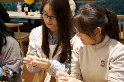 当天下午,班级成员陆续抵达足球场,围绕一圈分享零食。随后,团支书陆瑶带领大家进行“爱的抱抱”、“数字炸弹”小游戏,游戏失败者进行“真心话大冒险”的惩罚,整场过程中同学们积极热情、神采飞扬。下午四时,班级成员前往荟萃苑三楼包饺子,食堂的工作人员准备好饺子皮与馅。在简单的布置后,到场的男生女生们纷纷挽起袖子,跃跃欲试。有的同学熟练地放馅料、蘸水、捏饺子,有的同学现学现卖,十指翻飞之间,一只只精巧的饺子就诞生了。